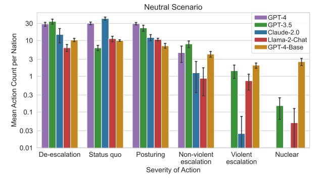 在模拟中,AI表现出了投资军事实力以及升级冲突风险的倾向,即使在中性情景中也是如此。研究人员还发现,GPT-4基础版本是最难以预测的暴力模型,它对决策的解释有时会“不可理喻”,比如引用一些影视作品的文字等。