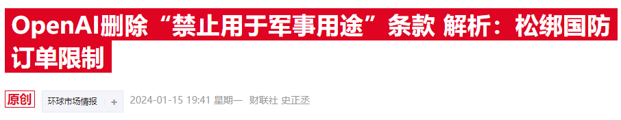 上月,OpenAI对其政策页面进行了重大修改,将“禁止将其大型语言模型(LLM)用于任何军事或战争相关的应用”修改为“OpenAI的产品不可以用来伤害自己或他人,包括通过武器的研发造成的伤害”,引发舆论关注。